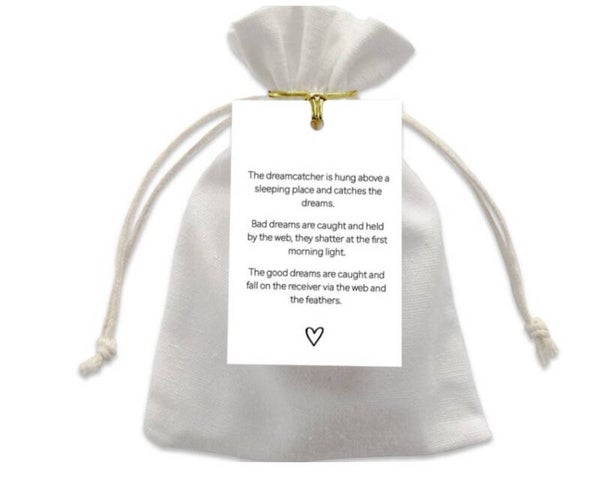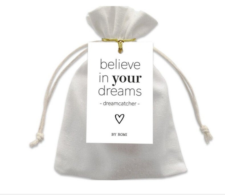 Dit zakje van By Romi is gevuld met een dromenvanger De tekst op het kaartje staat in het engels.