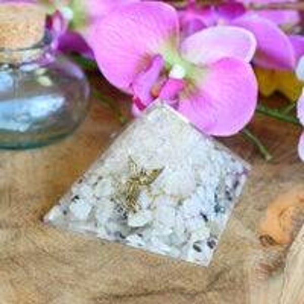 Orgonite Piramide Regenboog Maansteen/ Bergkristal – Engel